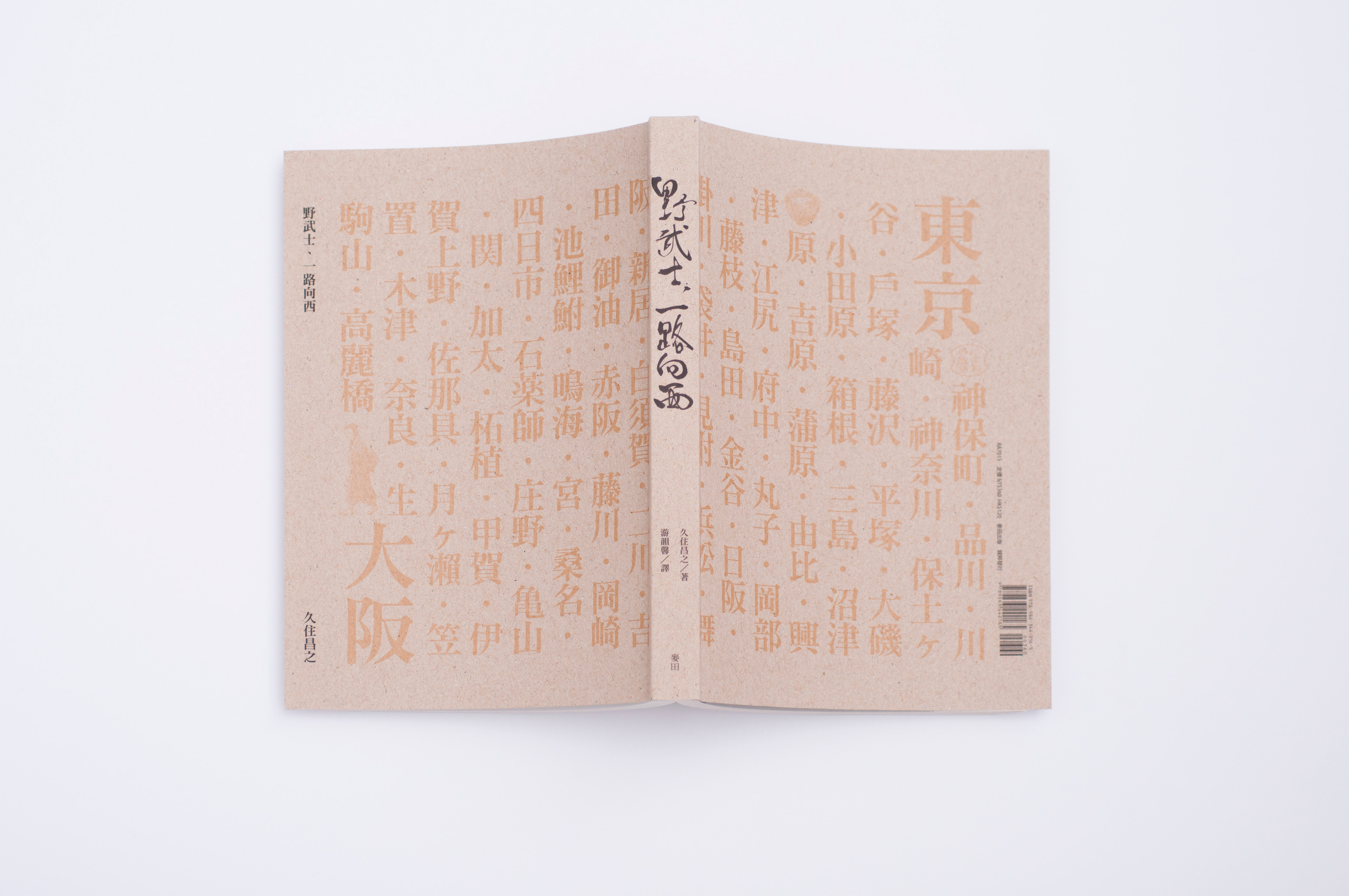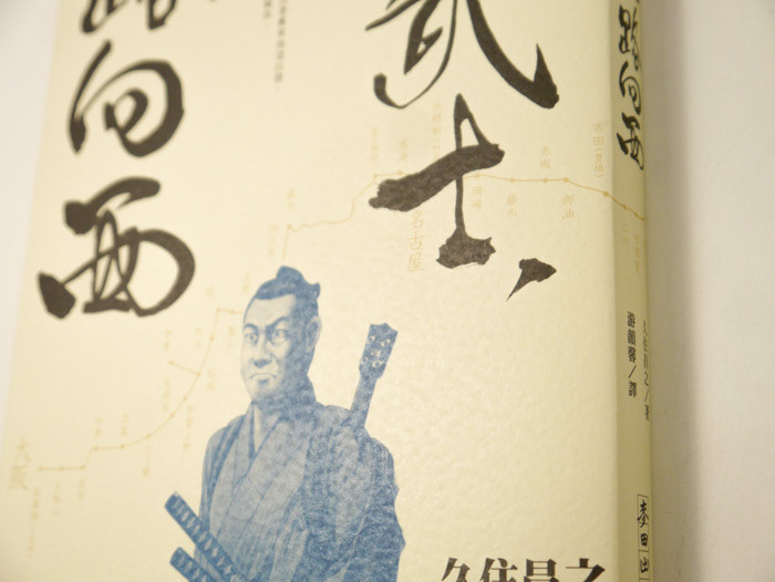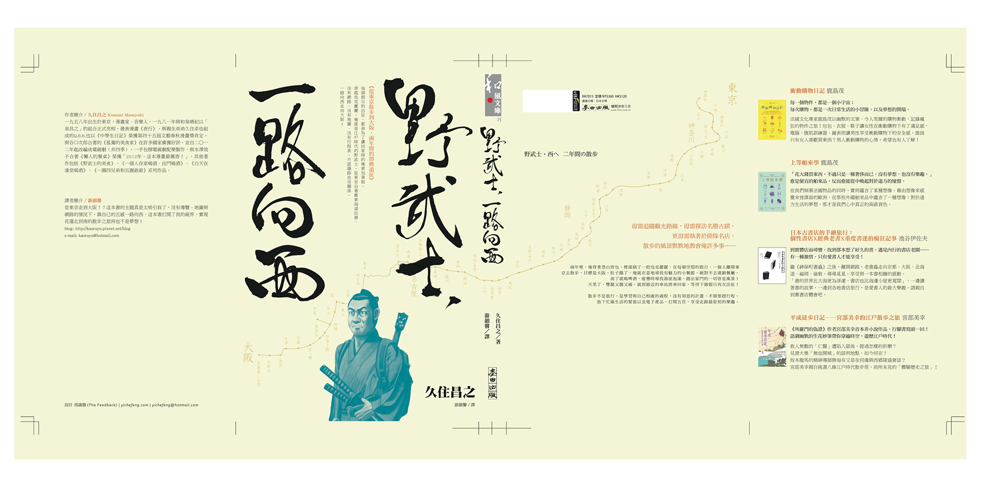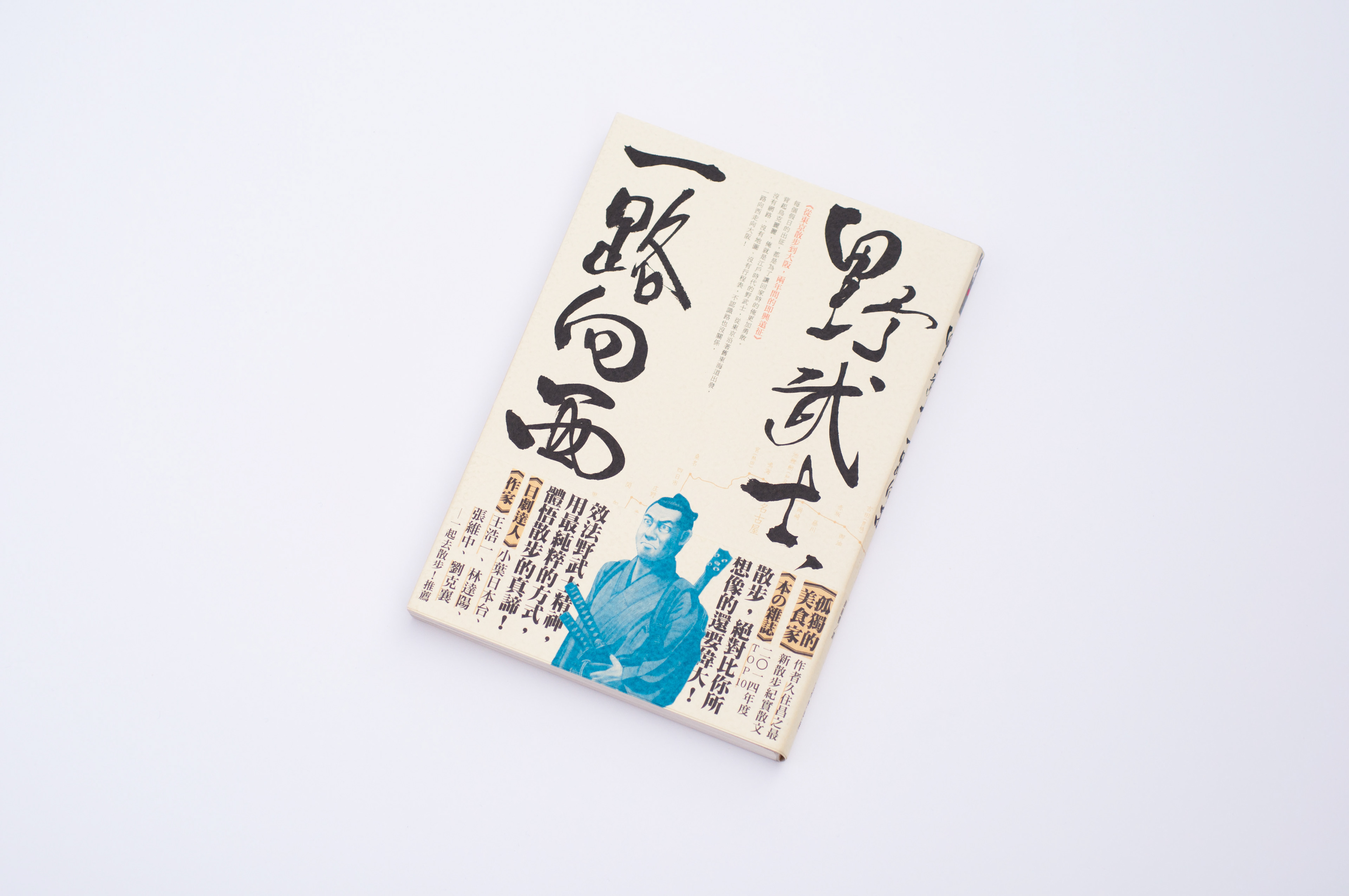書衣設計:以灑脫的毛筆字展現日本氣息與野武士的灑脫氣概。書中作者由東京徒步走至大阪,因此把路線圖也橫跨前後印出來。底色用米黃色呈現輕鬆感,再用對比藍色的武士搭配出整體的現代感。